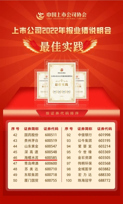 近日,中國(guó)上市公司協(xié)會(huì)發(fā)布“2022年報(bào)業(yè)績(jī)說明會(huì)最佳及優(yōu)秀實(shí)踐”評(píng)選結(jié)果,海螺水泥榮獲“上市公司2022年報(bào)業(yè)績(jī)說明會(huì)最佳實(shí)踐”獎(jiǎng)。