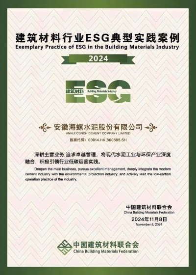 11月13至14日,中國建筑材料聯合會在北京召開2024年度建筑材料行業大會,會上發布了中國建筑材料行業ESG發展研究報告(2024)及典型案例,海螺水泥憑借在ESG方面的卓越實踐,成功入選“2024年度建筑材料行業ESG典型實踐案例”。