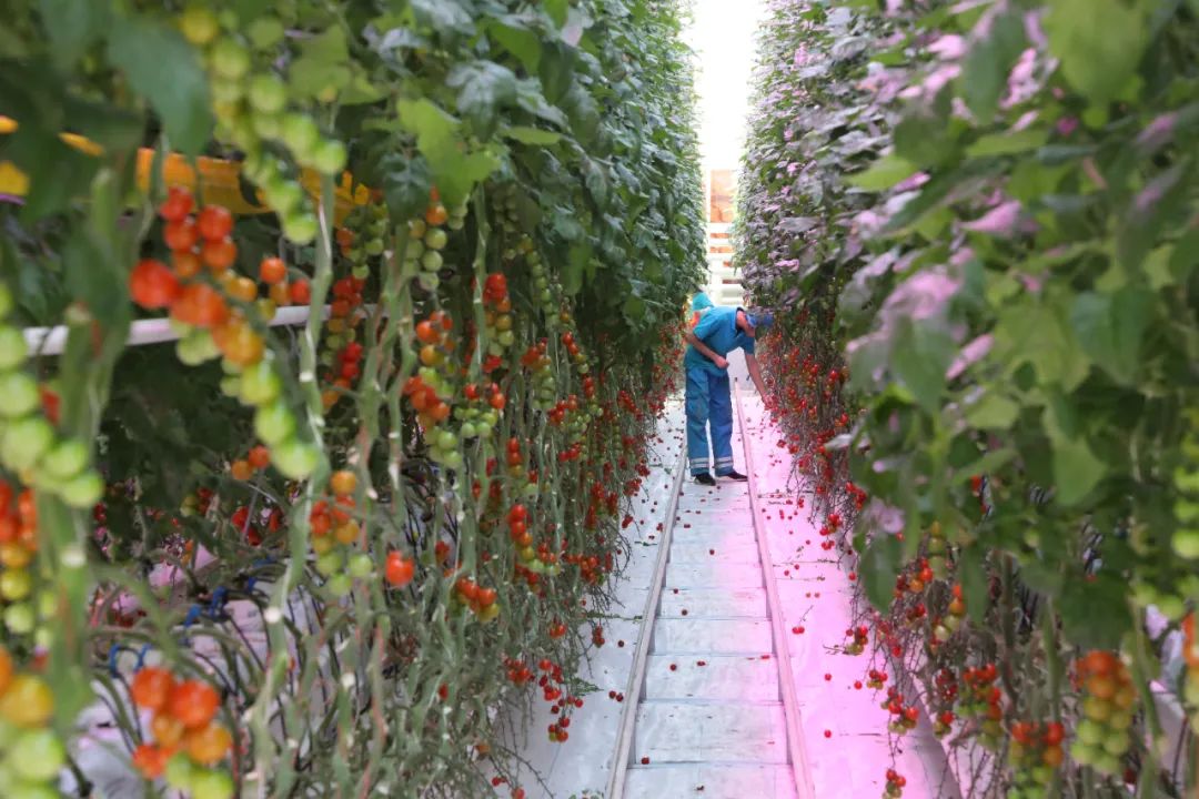 智能溫控室內(nèi),紅綠相間的小番茄顆粒飽滿、美味誘人。(羅廣心 攝)