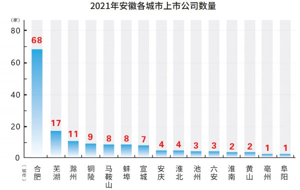 上市公司是區域經濟發展的“晴雨表”。截止2021年底,合肥上市公司數量達到68家,在省內遙遙領先,在全國內地289個城市排名居第14位;蕪湖和滁州上市公司數量分別為17家、11家。