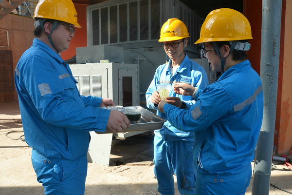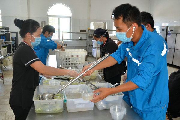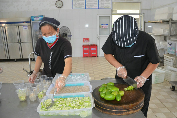 采摘下來的新鮮龍眼和檸檬很快被送往食堂,食堂師傅們忙碌起來,將飽滿多汁的龍眼剝殼取肉,檸檬切片榨汁,熬制當?shù)靥禺a(chǎn)涼粉草。龍眼果肉與檸檬片在清冽礦泉水中舒展,釋放出清甜與微酸的完美協(xié)奏;涼粉草熬制的“北流涼粉”,凝凍如墨玉,清涼解暑。天然原料經(jīng)巧手化作兩大消暑佳品——晶瑩剔透的龍眼檸檬水與地道爽滑的“北流涼粉”。冰鎮(zhèn)后的飲品帶著果香與涼意,被后勤人員分裝成杯,及時送到各崗位。