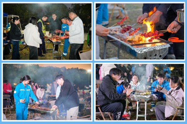 你看這邊的燒烤區,雖伴著冬季傍晚的微涼,卻處處洋溢著火熱的氣息。員工們自發組成燒烤小隊,分工協作、默契配合,有人熟練翻轉,精心控制火候讓食材能夠達到最佳風味;有人熱情分發調料和飲品,不時揮舞著熒光棒配合樂隊的演出節奏。平時忙于各自崗位的員工都在此刻化身為“燒烤大師”,在炊煙裊裊與歡聲笑語中,彼此間的距離迅速拉近,交流也變得自然而融洽。